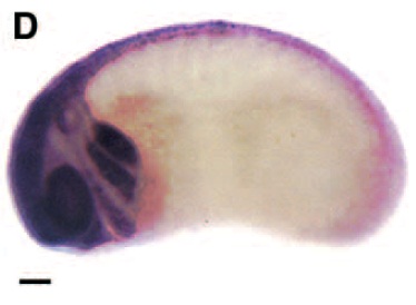 smad1 (SMAD family member 1) gene expression in Xenopus laevis embryo, assayed via in situ hybridization, NF stage 26, lateral view, anterior left, dorsal up. This image is extracted from figure published in: Thomsen GH (1996), Image published in: Thomsen GH (1996) Copyright © 1996. Image reproduced with permission of the Publisher and the copyright holder. This is an Open Access article distributed under the terms of the Creative Commons Attribution License.