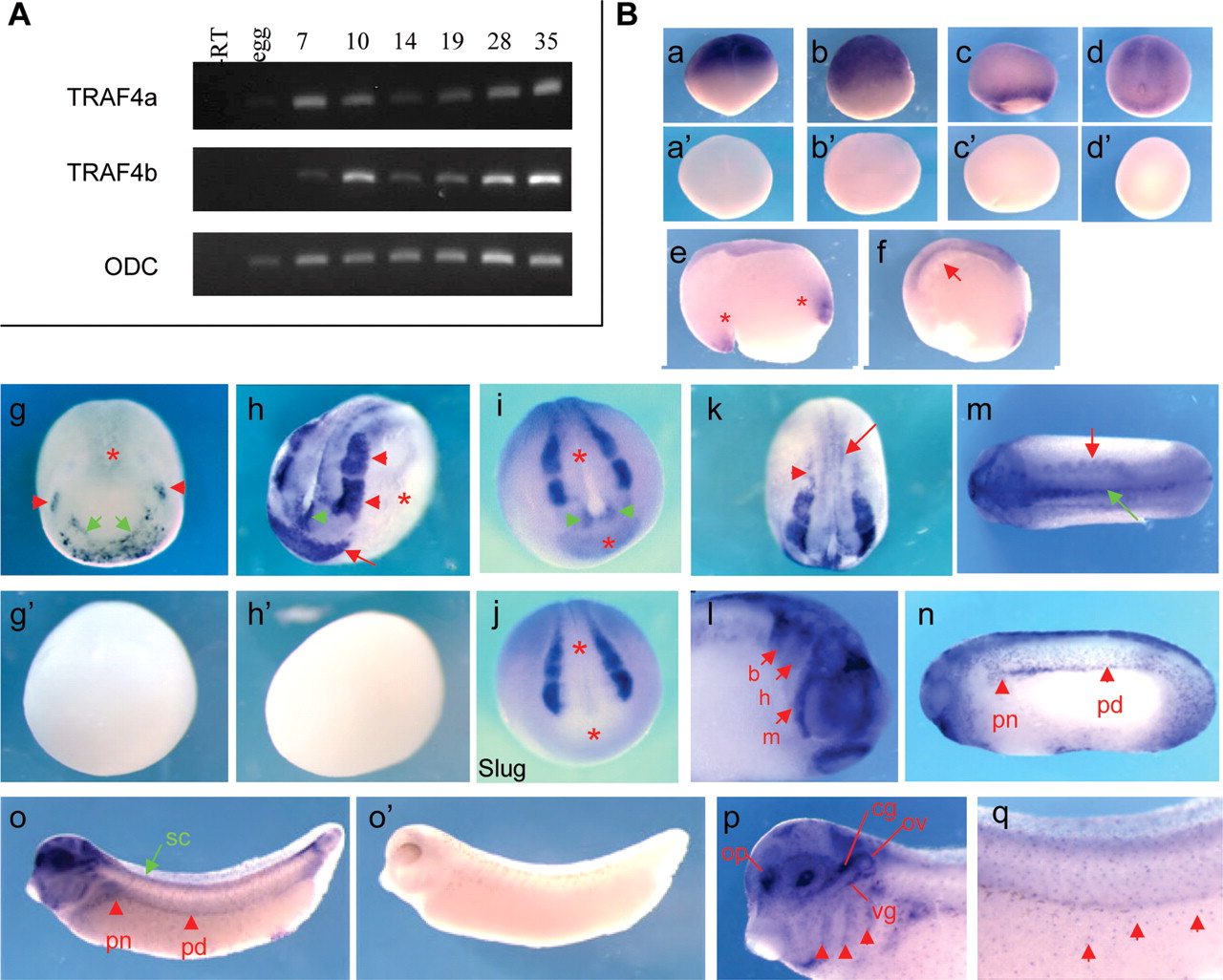 Figure 5. Regional and tissue-specific expression of TRAF4 genes during Xenopus embryonic development. (A) Temporal expression of TRAF4a and TRAF4b analyzed by RT-PCR. Ornithine decarboxylase (ODC) was scored as a loading and RNA processing control. (B) In situ RNA hybridization showing spatial expression of TRAF4 (aâq). Side views of four-cell (a), stage 8 (b), and stage 10.5 (c) embryos (animal pole up). Dorsal-posterior view of a stage 13 embryo (d) reveals TRAF4 expression in the neural plate. Sense controls are shown in aâ²âdâ². Sagittal sections of a stage 11 (e) and a stage 12.5 embryo (f) showing TRAF4 expression in the general mesoderm indicated with asterisk (e) and in the presumptive neural plate and the involuting mesoderm pointed with arrow (f). Dorsal-anterior view of a stage 14 embryo (g) and its sense control (gâ²). TRAF4 is expressed in the developing neural crest (red arrowheads), preplacodal and cement gland region (green arrows) and the posterior neural plate (asterisk). Anterior-lateral (h) and dorsal (k) views of a stage 17 embryo and sense control (hâ²). Strong expression of TRAF4 is detected in the cranial neural crest (red arrowheads), cement gland (red arrow) and the anterior neural fold hingepoints (green arrowhead) (h). Note the lack of expression in the nonneural ectoderm (asterisk) and weaker expression in the neural plate (h). TRAF4 is expressed in the lateral (arrowhead) and medial trunk neural crest (arrow) (k). Expression of TRAF4 (i) and Slug (j) in the anterior region of stage 17 embryos for comparison. Note that in the neural plate and the transverse neural fold TRAF4 is expressed, whereas Slug is not (asterisks). TRAF4 transcripts are enriched in the anterior neural hingepoints (green arrowheads) (i). Dorsal (anterior to the left) (m) and head (l) views of a stage 21 embryo. TRAF4 is expressed in the somites (red arrow) and the trunk neural crest (green arrow) (m) and in the mandibular (m), hyoid (h) and branchial (b) branches of the migrating cranial neural crest (arrowheads) (l). Lateral views of stage 25 (n) and stage 32 (o) embryos (anterior to the left). Red arrowheads point to TRAF4 expression in the pronephros (pn) and the pronephric duct (pd). TRAF4 also is expressed in the spinal cord (sc) (green arrow) (o). Sense control of a stage 32 embryo is shown in kâ². In the head region, TRAF4 expression is detected in neural crest and sensory placode derivatives (p): pharyngeal arches (arrowheads), otic vesicle (ov), olfactory placodes (op), cranial ganglia (cg), vagal ganglia (vg). TRAF4 is expressed in the melanoblasts (arrowheads) (r), which are also neural crest derivatives. Image published in: Kalkan T et al. (2009) Copyright © 2009. Image reproduced with permission of the Publisher, American Society for Cell Biology (ASCB). This is an Open Access article distributed under the terms of the Creative Commons Attribution License.