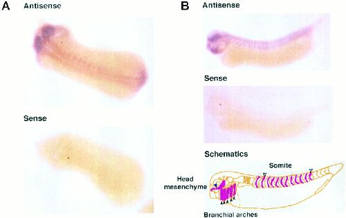 Whole mount in situhybridization of XSII-K1 mRNA. Embryos at the neurula stage (A), and tail bud stage (B) were treated with the antisense or sense probe of XSII-K1. For hybridization-positive tissues, head mesenchyme, somite, and branchial arches are indicated by blue, white, andblack arrowheads, respectively. Illustration represents a tail-bud stage embryo. Image published in: Taira Y et al. (2000) Copyright © 2000. Image reproduced with permission of the Publisher.