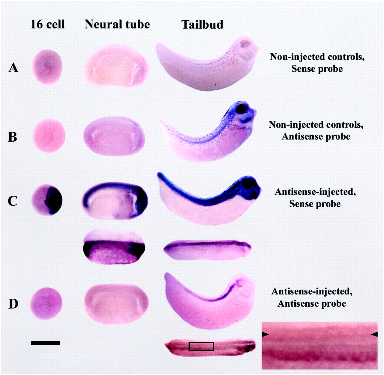 Inhibition of expression of xKv3.1transcripts by antisense RNA injection is visualized by in situ hybridization of whole-mount Xenopus embryos with a xKv3.1-specific antisense probe. A, Sense (S) probe gives no signal in uninjected control embryos. B, AS probe reveals that endogenous xKv3.1 mRNA is present in the spinal cord of control embryos at stage 22 and thereafter (Gurantz et al., 2000).C, S probe labeling of AS-injected embryos demonstrates stability of injected xKv3.1 AS. Signal is observed in 16-cell through stage 30 embryos; dorsal view of another embryo indicates that only the injected side of the embryo (top) contains AS. D, Injection of xKv3.1 AS reduces the endogenous signal detected with the AS probe. Dorsal view of another embryo indicates that reduction of the in situ hybridization signal is restricted to the injected side (top, arrowheads). Area inbox is enlarged at right. For all embryos anterior is to the right and dorsal isup. Scale bar, 1 mm. Black spots on tailbud embryos are melanocytes. Image published in: Vincent A et al. (2000) Copyright © 2000. OA ARTICLE, images redisplayed under a Creative Commons license.