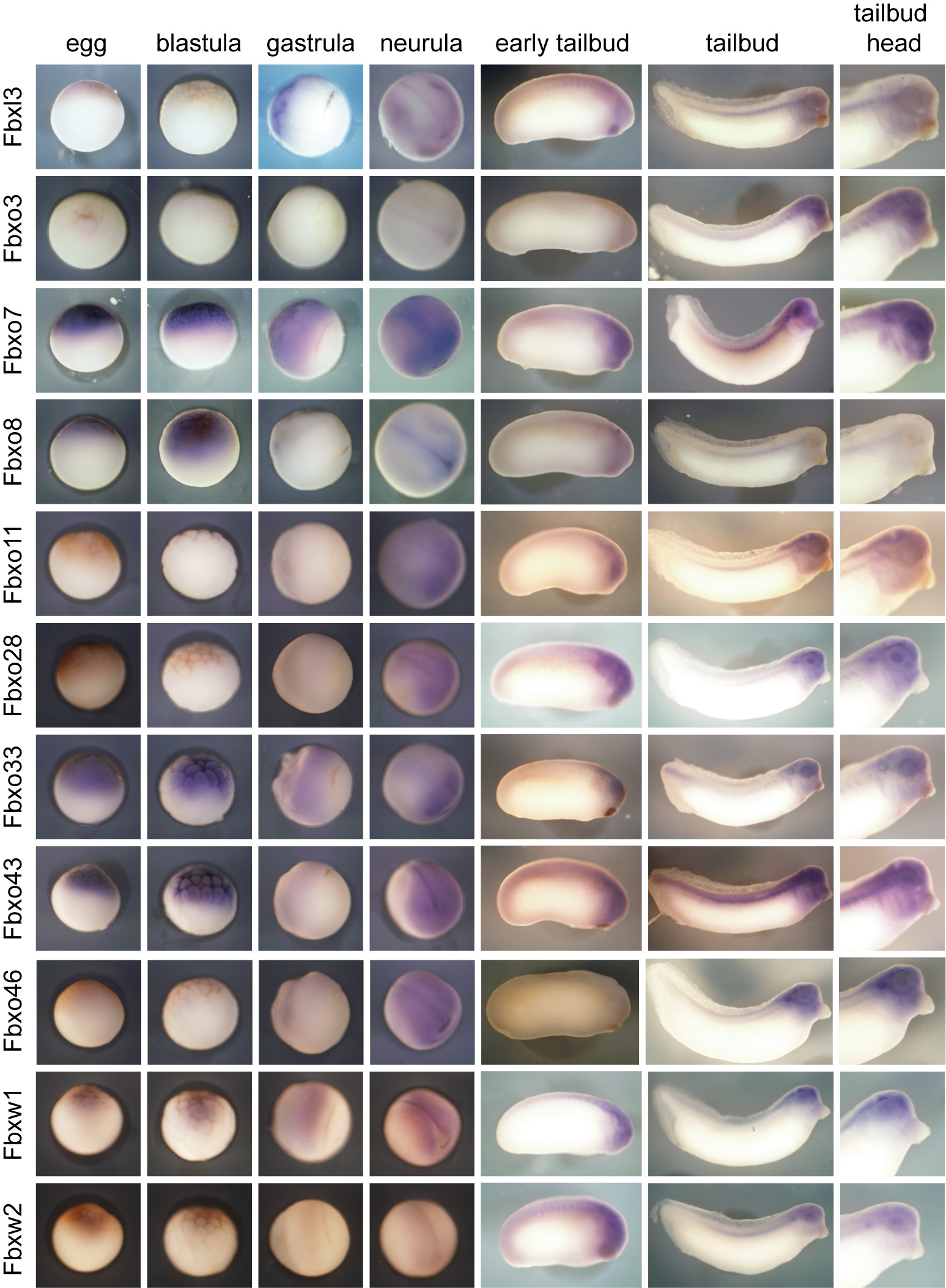 S2 Fig. Spatial expression of F-box genes with diffused expression during X. laevis development using in situ hybridizations. Embryos positions: egg and blastula embryos, lateral view with animal side up; gastrula embryos, lateral view with dorsal up and vegetal to the right; neurula embryos dorso-lateral view with anterior to the right; tailbud embryos, lateral view with anterior to the right. doi:10.1371/journal.pone.0136929.s002