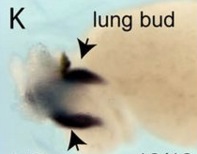 sftpc (surfactant, pulmonary-associated protein C ) gene expression in Xenopus tropicalis embryo, assayed via in situ hybridization, NF stage 42, isolated gut tube, anterior left.