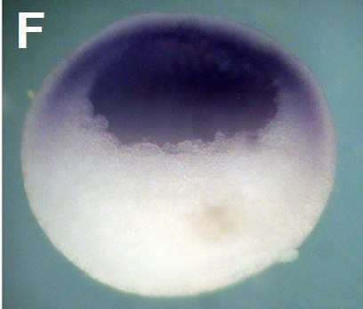 slc18a2 (solute carrier family 18 (vesicular monoamine transporter), member 2) gene expression in bisected Xenopus laevis embryo, mid-sagittal section, assayed via in situ hybridization, NF stage 10, dorsal right, animal hemisphere up. This image is extracted from figure published in: Nikishin DA et al. (2012), Image published in: Nikishin DA et al. (2012) Copyright © 2012. Image reproduced with permission of the Publisher.