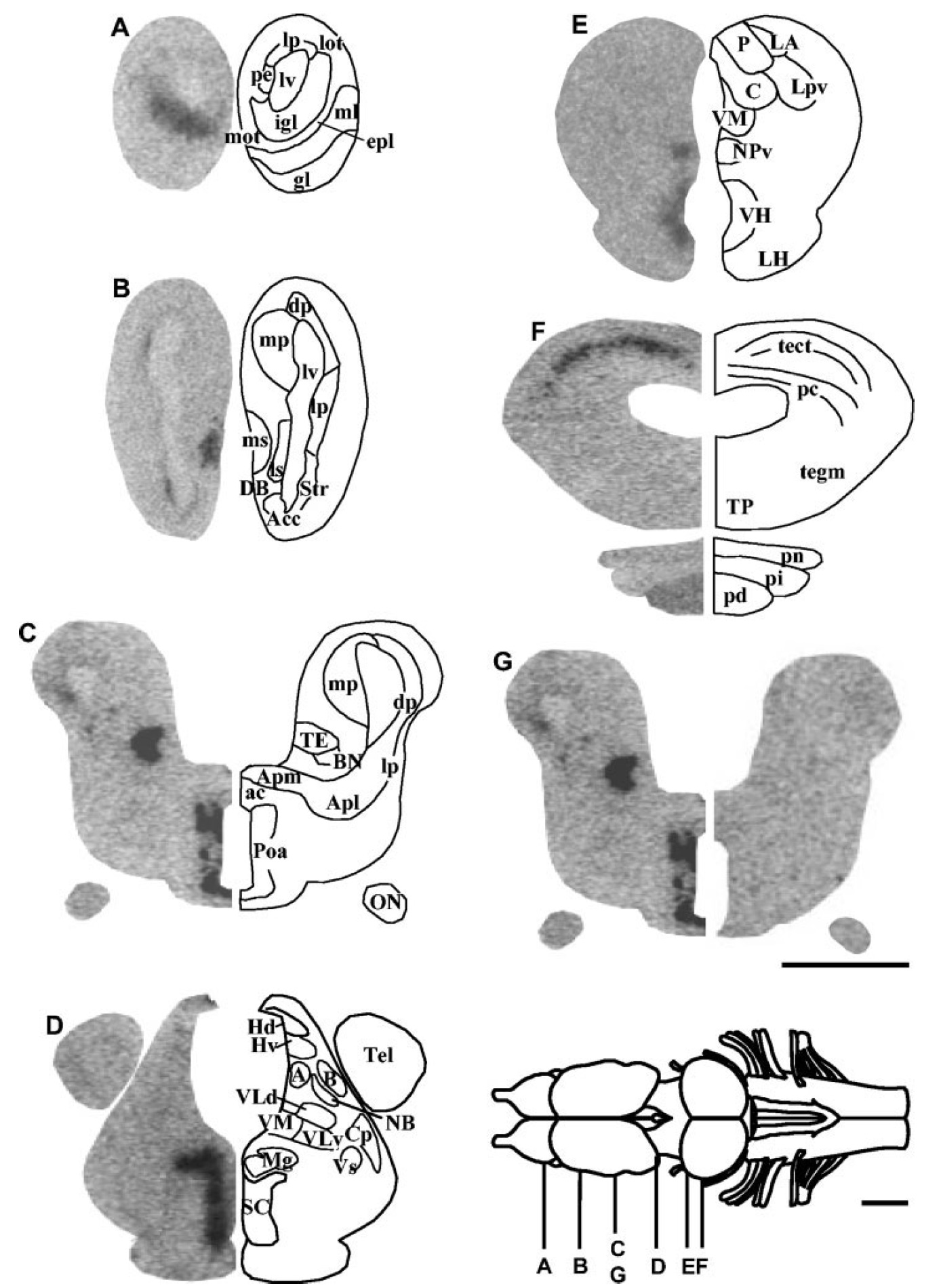 G: A control section incubated with a sense riboprobe (right hemisection)