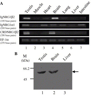 Fig. 2. (A) Tissue distribution in mRNA expression of NRG1 isoforms in adult X. laevis. Total RNA was extracted from the testis (lane 1), muscle (lane 2), heart (lane 3), brain (lane 4), lung (lane 5), liver (lane 6), and intestine (lane 7) of adult X. laevis and subjected to RT-PCR with primers specific for each isoform, IgNRG1β2 (top panel), IgNRG1α1 (2nd panel), and CRDNRG1β2 (3rd panel). The amplified products were analyzed by 1% agarose gel electrophoresis and visualized under ultraviolet irradiation by ethidium bromide staining. EF-1α is used as an internal control (25 cycles, 270 base pairs, bottom panel). (B) Endogenous expression of IgNRG1β2 in the tissues of adult X. laevis. Ig-like domain-containing proteins were enriched from the extract of the testis (lane 1), brain (lane 2), and liver (lane 3) using heparinâSepharose and then subjected to SDSâ10% PAGE followed by Western blotting with an anti-EGFβ2 antiserum. Image published in: Eto K et al. (2006) Copyright © 2006. Image reproduced with permission of the Publisher.