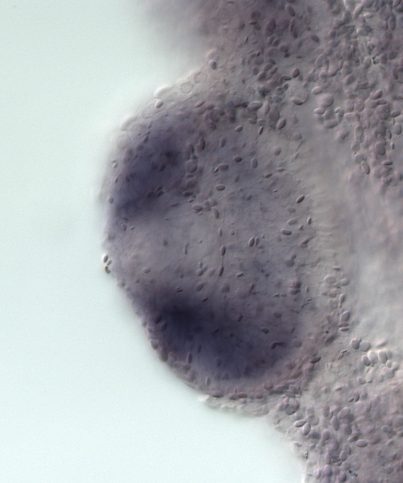 pknox1 (PBX/knotted 1 homeobox 1) gene expression in sectioned eye of X. laevis embryo, assayed via in situ hybridization, NF stage 39-40, lens epithelium and anterior left, dorsal up. Copyright © Perron Lab