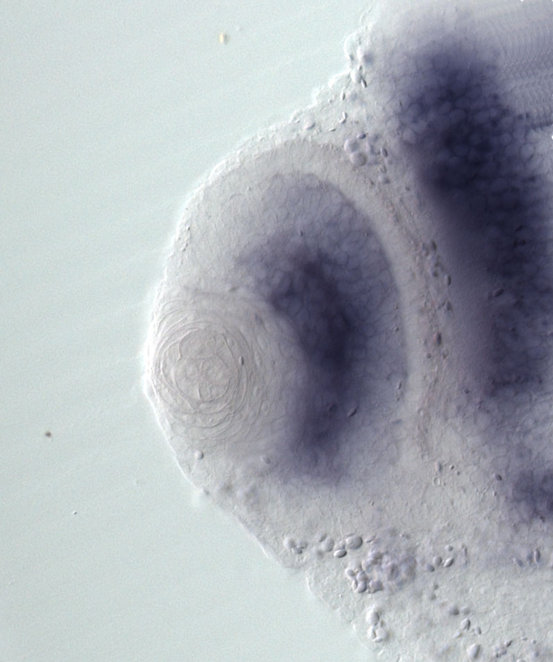 gucy1b3 (guanylate cyclase 1, soluble, beta 3) gene expression in sectioned eye of X. laevis embryo, assayed via in situ hybridization, NF stage 39-40, lens epithelium and anterior left, dorsal up. Copyright © Perron Lab