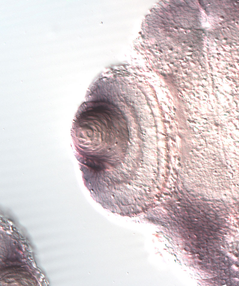 lpin2 (lipin 2 L homeolog) gene expression in sectioned eye of X. laevis embryo, assayed via in situ hybridization, NF stage 39-40, lens epithelium and anterior left, dorsal up.