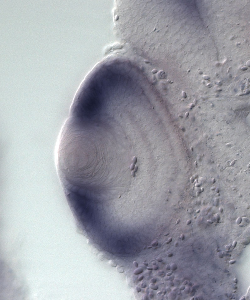 kptn (kaptin (actin binding protein)) gene expression in sectioned eye of X. laevis embryo, assayed via in situ hybridization, NF stage 39-40, lens epithelium and anterior left, dorsal up. Copyright © Perron Lab