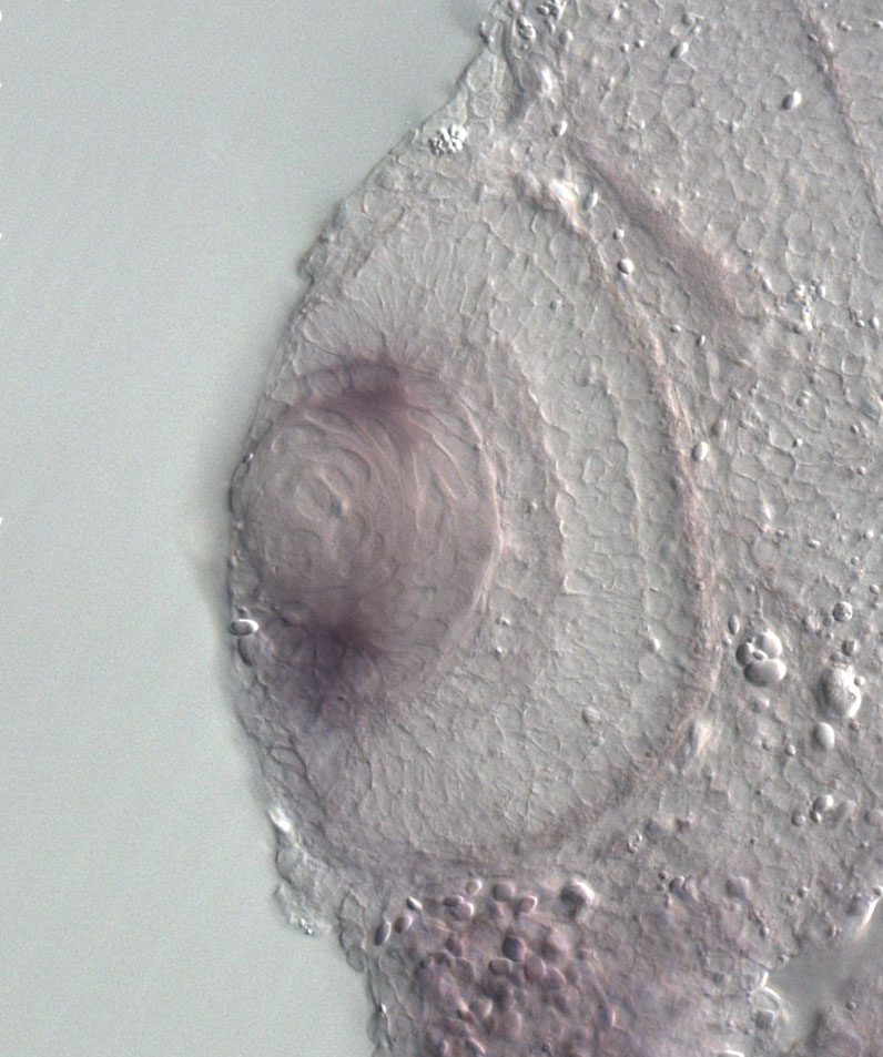 phactr4 (phosphatase and actin regulator 4) gene expression in sectioned eye of X. laevis embryo, assayed via in situ hybridization, NF stage 39-40, lens epithelium and anterior left, dorsal up. Copyright © Perron Lab