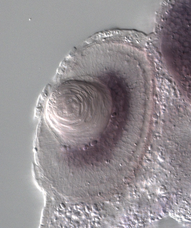 pgbd5 (piggyBac transposable element derived 5) gene expression in sectioned eye of X. laevis embryo, assayed via in situ hybridization, NF stage 39-40, lens epithelium and anterior left, dorsal up. Copyright © Perron Lab
