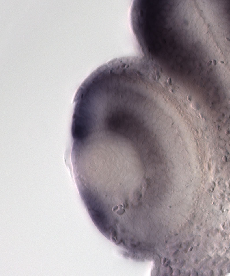 golm2 ( golgi membrane protein 2 ) gene expression in sectioned eye of X. laevis embryo, assayed via in situ hybridization, NF stage 39-40, lens epithelium and anterior left, dorsal up. Copyright © Perron Lab