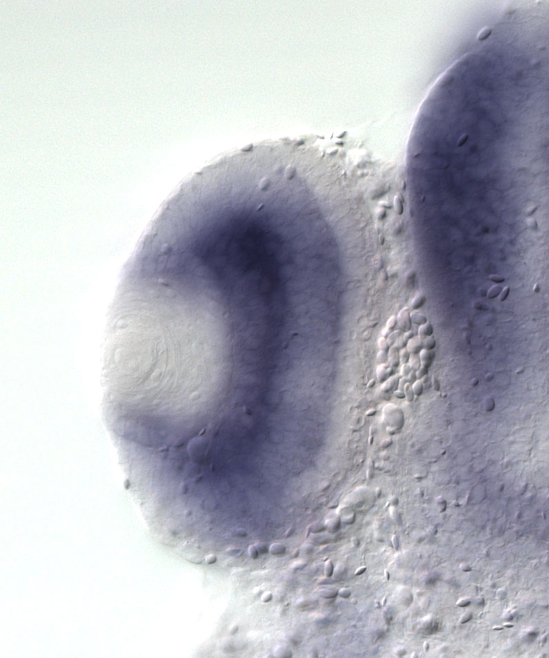 lrba (LPS-responsive vesicle trafficking, beach and anchor containing) gene expression in sectioned eye of X. laevis embryo, assayed via in situ hybridization, NF stage 39-40, lens epithelium and anterior left, dorsal up. Copyright © Perron Lab