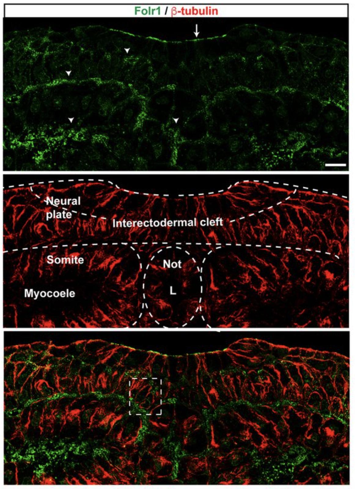 Anti-folr1 Ab (green) in Xenopus laevis at NFstage 15. Transverse sections, dorsal up. Showing Folr1 localization at the apical surface of the neural plate (arrow) and localization in extracellular spaces (arrowheads).