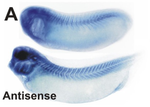 ptpn11b (protein tyrosine phosphatase, non-receptor type 11, b) gene expression in Xenopus laevis embryo, assayed via in situ hybridization, NF stage 22 and 28, lateral view, anterior left, dorsal up. This image is extracted from figure published in: Qian YK et al. (2008), Image published in: Qian YK et al. (2008) Copyright © 2008 Qian et al; licensee BioMed Central Ltd. Creative Commons Attribution license