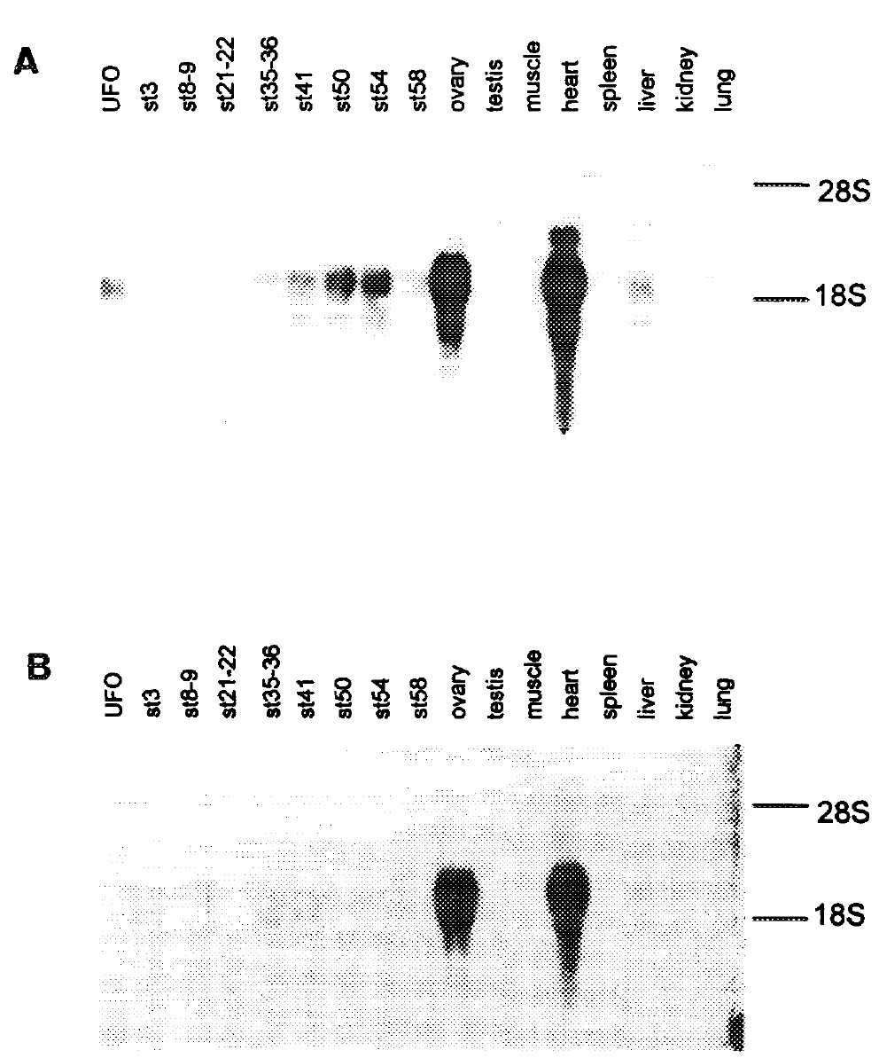 Fig. 3 Northern blot analysis of XC36 mRNAs during Xenopus development and in Xenopus adult tissues. See article pdf for full caption. Image published in: Van Hoof C et al. (1995) Copyright © 1995. Image reproduced with permission of the Publisher. Larger Image Printer Friendly View |
