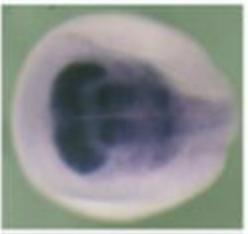 ccnd1 (cyclin D1) gene expression in Xenopus laevis embryo, assayed via insitu hybridization, NF stage 15-20, dorsal view, anterior left. This image is extracted from figure published in: Zhang Z et al. (2017) Copyright © 2017. Image reproduced with permission of the Publisher and the copyright holder. This is an Open Access article distributed under the terms of the Creative Commons Attribution License.