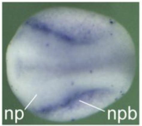 hgf (hepatocyte growth factor) gene expression in Xenopus laevis embryo, assayed via in situ hybridization, NF stage 15-20, dorsal view, anterior left. This image is extracted from figure published in: Zhang Z et al. (2017) Copyright © 2017. Image reproduced with permission of the Publisher and the copyright holder. This is an Open Access article distributed under the terms of the Creative Commons Attribution License.