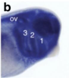 gsk3a (glycogen synthase kinase 3 alpha) gene expression in Xenopus laevis embryo, assayed via in situ hybridization, NF stage 25, lateral view, anterior right, dorsal up. This image is extracted from figure published in: Gonzalez Malagon SG et al. (2018) Image downloaded from an Open Access article in PubMed Central. © The Author(s) 2018