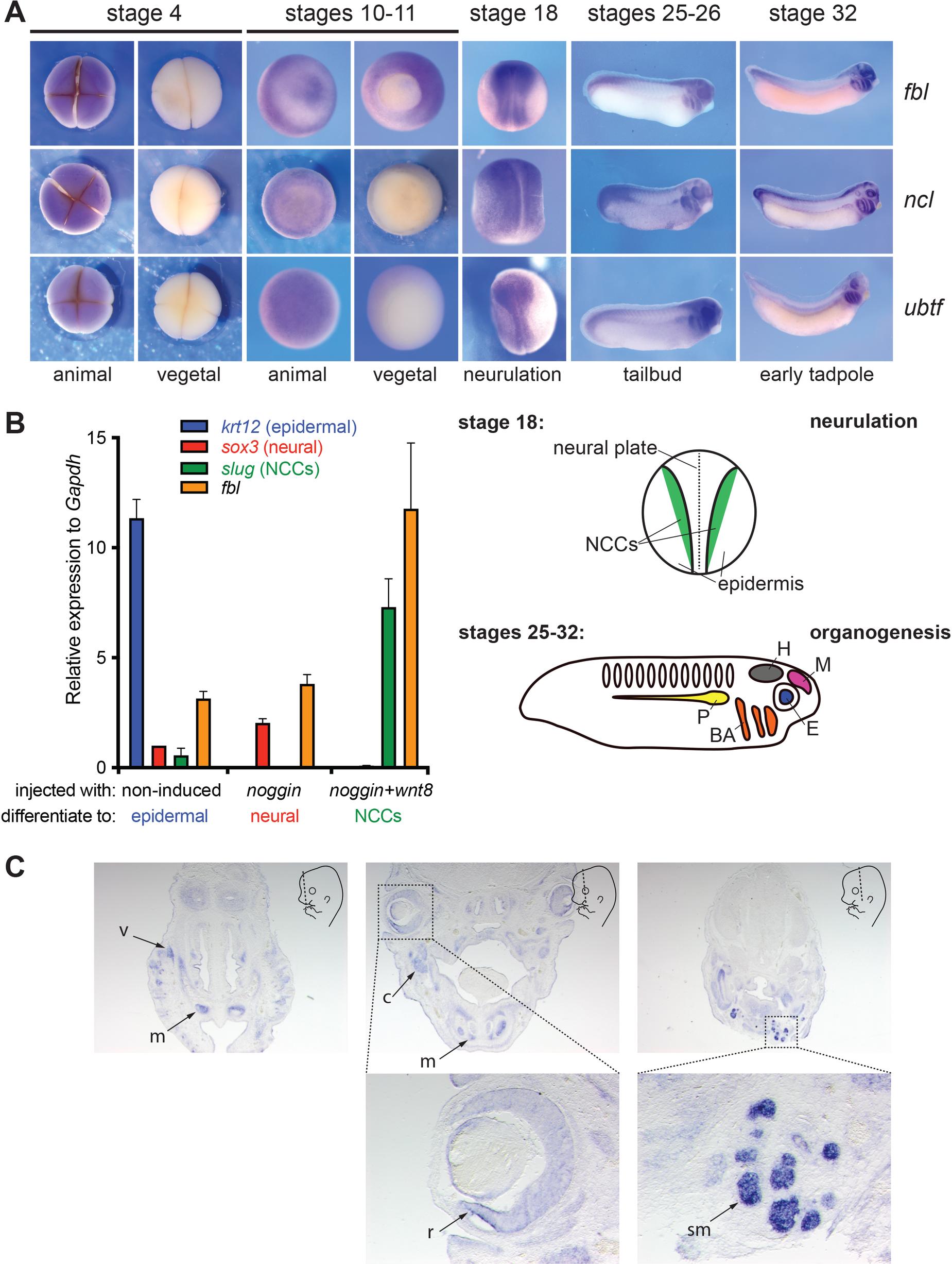 A, fbl, ncl, and ubtf mRNAs were detected in X. laevis during development by whole mount in situ hybridization (WISH). The stages and, where relevant, the animal and vegetal poles are indicated. The schematics highlight the labeled structures at stage 18 (neurulation) and at stages 25â32 (organogenesis). NCCs, neural crest cells; H, hindbrain; M, midbrain; E, eyes; P, pronephros; BA, branchial arches. B, fbl expression was analyzed by RT-qPCR in animal cap explants injected either with noggin (to induce differentiation to neural tissue detected with sox3) or with noggin and wnt8 (to stimulate differentiation to neural crest tissue detected with slug). Non-induced (non-injected) cap explants naturally differentiate to epiderm detected with krt12. As a control, expression of the inspected genes was normalized to gapdh. fbl was most abundantly expressed in neural crest tissue. C, Spatial distribution of fbl mRNAs established by WISH in E14.5 mouse embryos. The schematics indicate the orientation of the section plane (dashed line). v, vibrissae; m, mesenchyma; c, primordium of mandibular cartilage; r, retina; sm, submandibular glands. Image published in: Delhermite J et al. (2022) © 2022 Delhermite et al. Creative Commons Attribution license