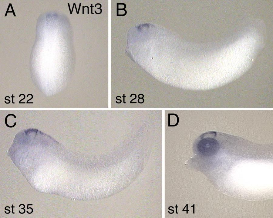 Figure 3. In situ hybridization analysis of Wnt3 expression during Xenopus embryonic development. A: Dorsal view of stage 22 embryo showing Wnt3 transcripts in the anterior region of the brain corresponding to the midbrain. B: Lateral view of stage 28 embryo showing expression of Wnt3 in the midbrain. C: Lateral view of stage 35 embryo showing expression of Wnt3 in the midbrain and extending into the hindbrain. D: Lateral view of the head region of a stage 41 embryo showing expression of Wnt3 in the midbrain and in the eye. GenBank accession number, DQ658158 Image published in: Garriock RJ et al. (2007) Copyright © 2007. Image reproduced with permission of the Publisher, John Wiley & Sons.