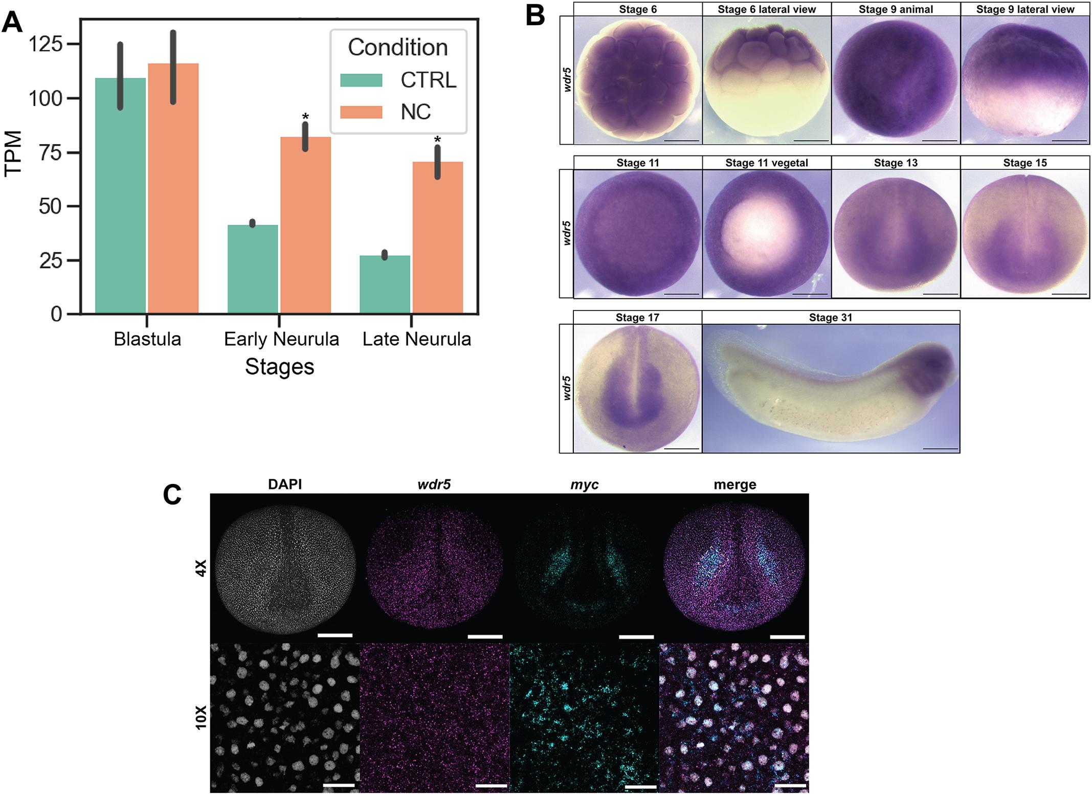 Fig. 1. Characterization of wdr5 expression. (A) Analysis of previously published RNA-Seq data (York et al., 2024) shows wdr5 transcripts are abundant in the animal pole cells of the blastula stages and differentially enriched in neural crest-induced animal caps at early and late neurula stages (*P<0.05). (B) Spatial and temporal expression of wdr5 shows that wdr5 transcripts are maternally provided, enriched in blastula stem cells and retained broadly throughout the neuroectoderm into developing neural crest stem cells and neural crest derivatives. (C) Fluorescent in situ hybridization chain reaction confirms wdr5 expression in the neural crest that colocalizes with myc a canonical neural crest and pluripotency factor. CTRL, control; NC, neural crest; TPM, transcripts per million. Scale bars: 250[micrometers] in B and C (10 images); 100[micrometers] in C (4 images). Image published in: Compton K et al. (2026) © 2026. Creative Commons Attribution license Larger Image Printer Friendly View |
