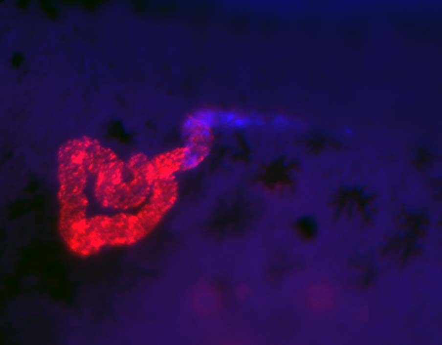 slc12a1 (solute carrier family 12 member 1) gene expression in Xenopus laevis embryo, assayed via fluorescent in situ hybridization (in red), NF stage 37 & 38, lateral view, mid-trunk region only, anterior left, dorsal up. (Note counterstained with NBC1/slc4a4 in blue). Copyright © Vize Lab