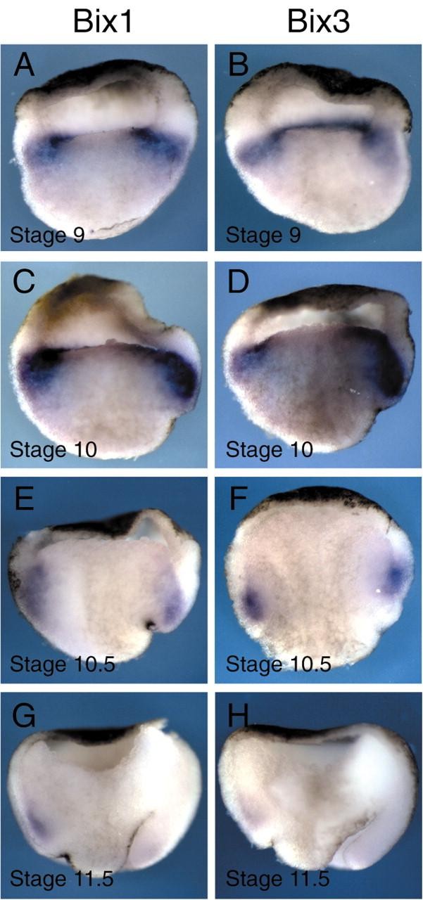 Fig. 1. The expression patterns of Bix1 and Bix3. In situ hybridization was performed on bisected embryos at the indicated stages using probes specific for Bix1 and Bix3. In C-H, dorsal is to the right.