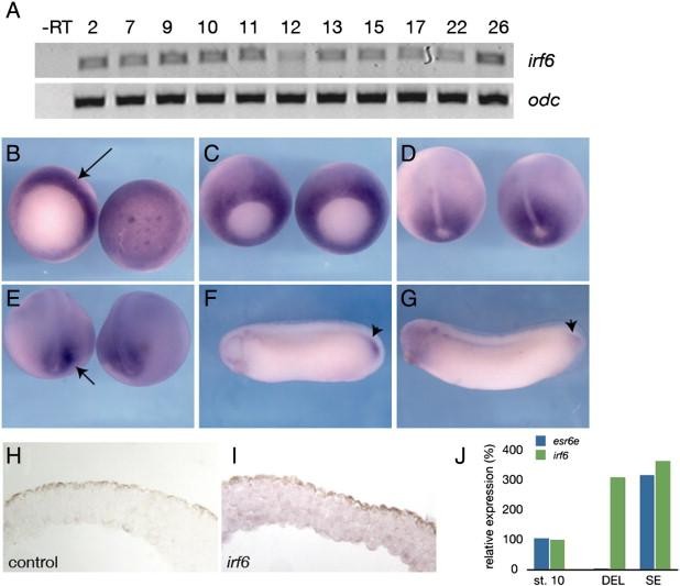 Fig. 5. Expression of irf6 in Xenopus laevis. (A) RT-PCR analysis of irf6 expression at different stages of development. Developmental stages are indicated at the top (Nieuwkoop and Faber, 1956). − RT, negative control reaction without reverse transcriptase. (B–G) Whole mount in situ hybridization for irf6. (B) Stage 10.5, left is vegetal view, arrow indicates expression in the dorsal marginal zone. Right is animal pole view. (C) Stage 11, expression is throughout marginal zone, but beginning to be lost from dorsal midline. (D) Stage 12.5, expression around blastopore, absent from prospective notochord. (E) Stage 18, expression flanking prospective tailbud region, arrow. (F) Stage 28 and (G) stage 30, notable expression in tailbud, arrowheads. (H) Section of animal cap hybridized with an irrelevant control probe (xnr3). (I) Section of animal cap hybridized with an antisense irf6 probe. Diffuse expression is found in both superficial and deep layers. (J) Quantitative RT-PCR of irf6 (green) and esr6e (blue) expression in ectodermal explants; st. 10 (stage 10 whole embryo), DEL (deep layer explant), SE (superficial layer explant).