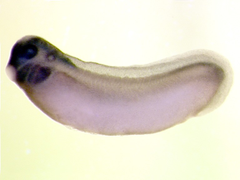 slbp (stem-loop histone mRNA binding protein ) gene expression in Xenopus laevis, NF stage 28 embryo, in situ hybridization, lateral view, anterior left. Copyright © CNRS UMR 8080, Nicolas Pollet Image published in: AXELDB Database, AxelDB (Image Pages)