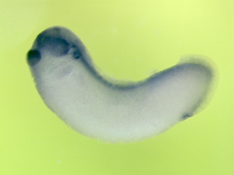 rab27a gene expression in Xenopus laevis embryo via in situ hybridization, NF stage 28, lateral view, anterior left.
