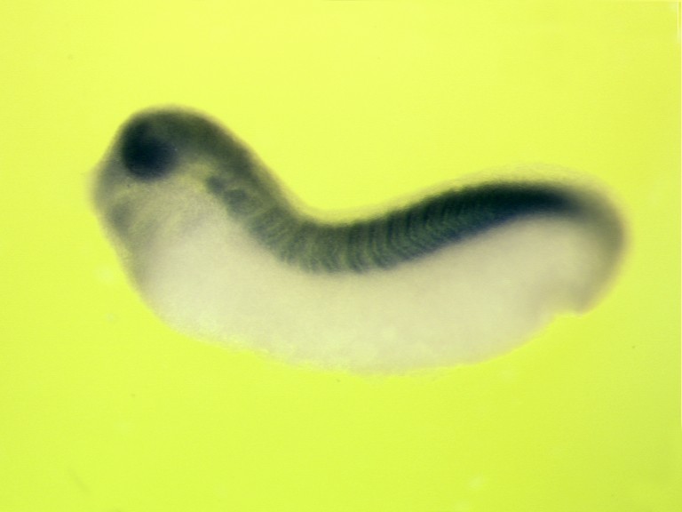 samd4b gene expression in Xenopus laevis embryo via in situ hybridization, NF stage 26, lateral view, anterior left. Image copyrighted by Pollet, Nicolas