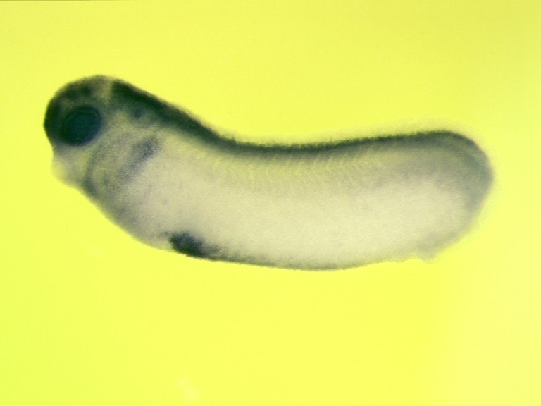 kiaa0182 gene expression in Xenopus laevis embryo via in situ hybridization, NF stage 29 & 30, lateral view, anterior left.
