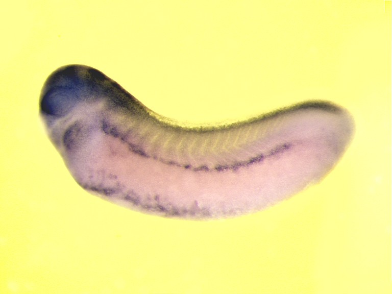 ddx55 < DEAD (Asp-Glu-Ala-Asp) box polypeptide 55 > gene expression in Xenopus laevis, NF stage 27 embryo, in situ hybridization, lateral view, anterior left.