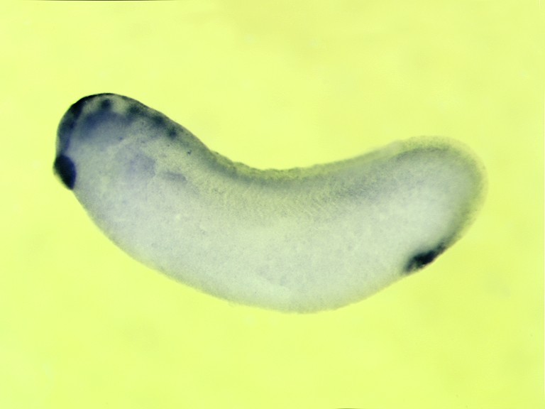 sqstm1 gene expression in Xenopus laevis embryo via in situ hybridization, NF stage 28, lateral view, anterior left.