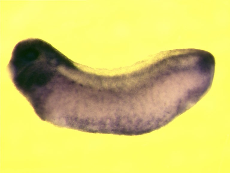 cdc6 < cell division cycle 6 homolog> gene expression in Xenopus laevis, NF stage 28 embryo, in situ hybridization, lateral view, anterior left.
