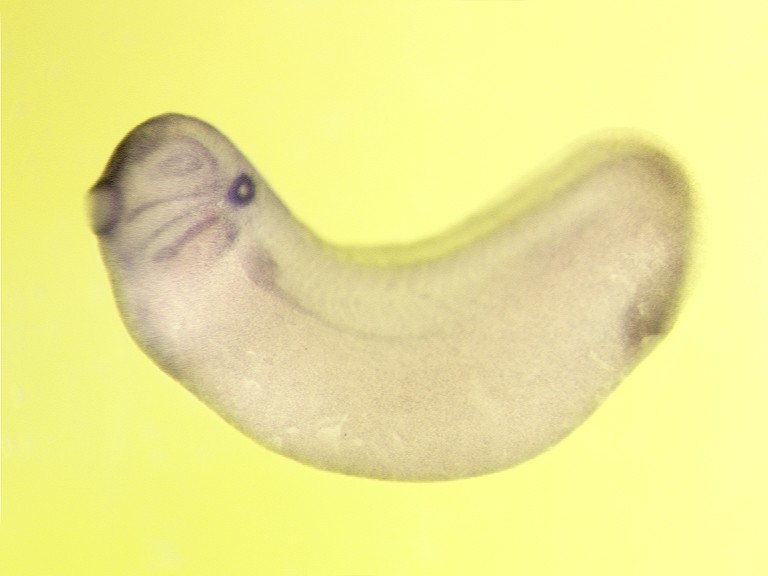 tle2 (transducin-like enhancer of split 2) gene expression in Xenopus laevis embryo, assayed via in situ hybridization, NF stage 28, lateral view, anterior left, dorsal up. Copyright © CNRS UMR 8080, Nicolas Pollet Image published in: AXELDB Database, AxelDB (Image Pages)
