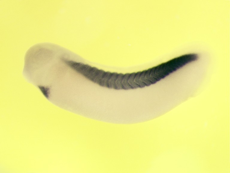 nexn (nexilin (F actin binding protein)) expressed in Xenopus laevis embryo via in situ hybridization, stage 29 and 30, lateral view, anterior left. Copyright © CNRS UMR 8080, Nicolas Pollet