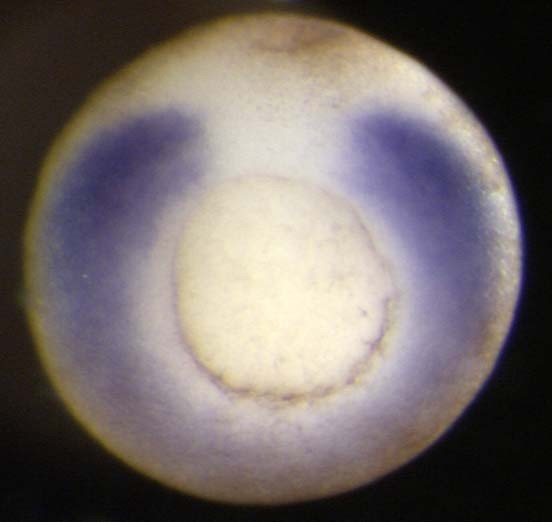 hoxd1 (homeobox D1 ) gene expression in Xenopus laevis embryo, NF stage 11.5, assayed by in situ hybridization,vegetal/blastoporal view, dorsal up. Copyright © Durston Lab (retired)