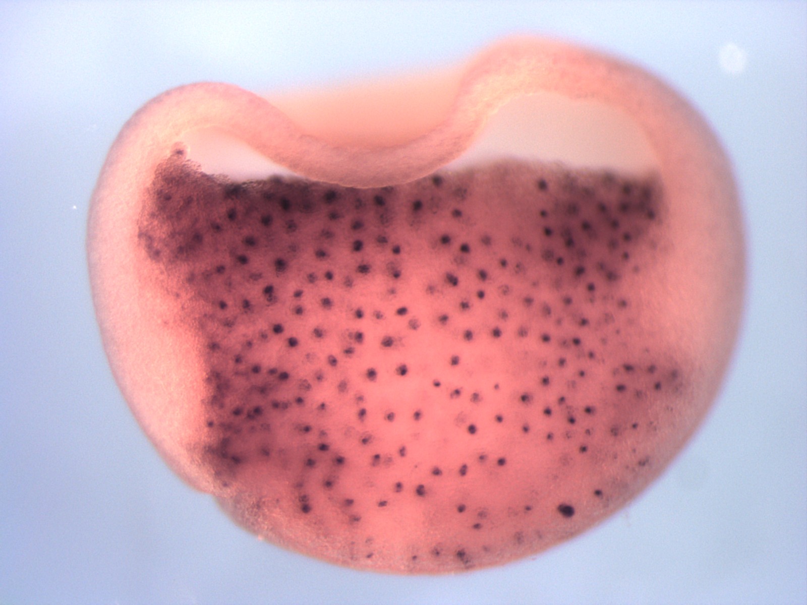 gata6-b (GATA binding protein 6-b) expressed in Xenopus laevis embryo via in situ hybridization, stage 10 (bisected), dorsal left. Copyright © Zorn Lab, Aaron M Zorn Image published in: Zorn