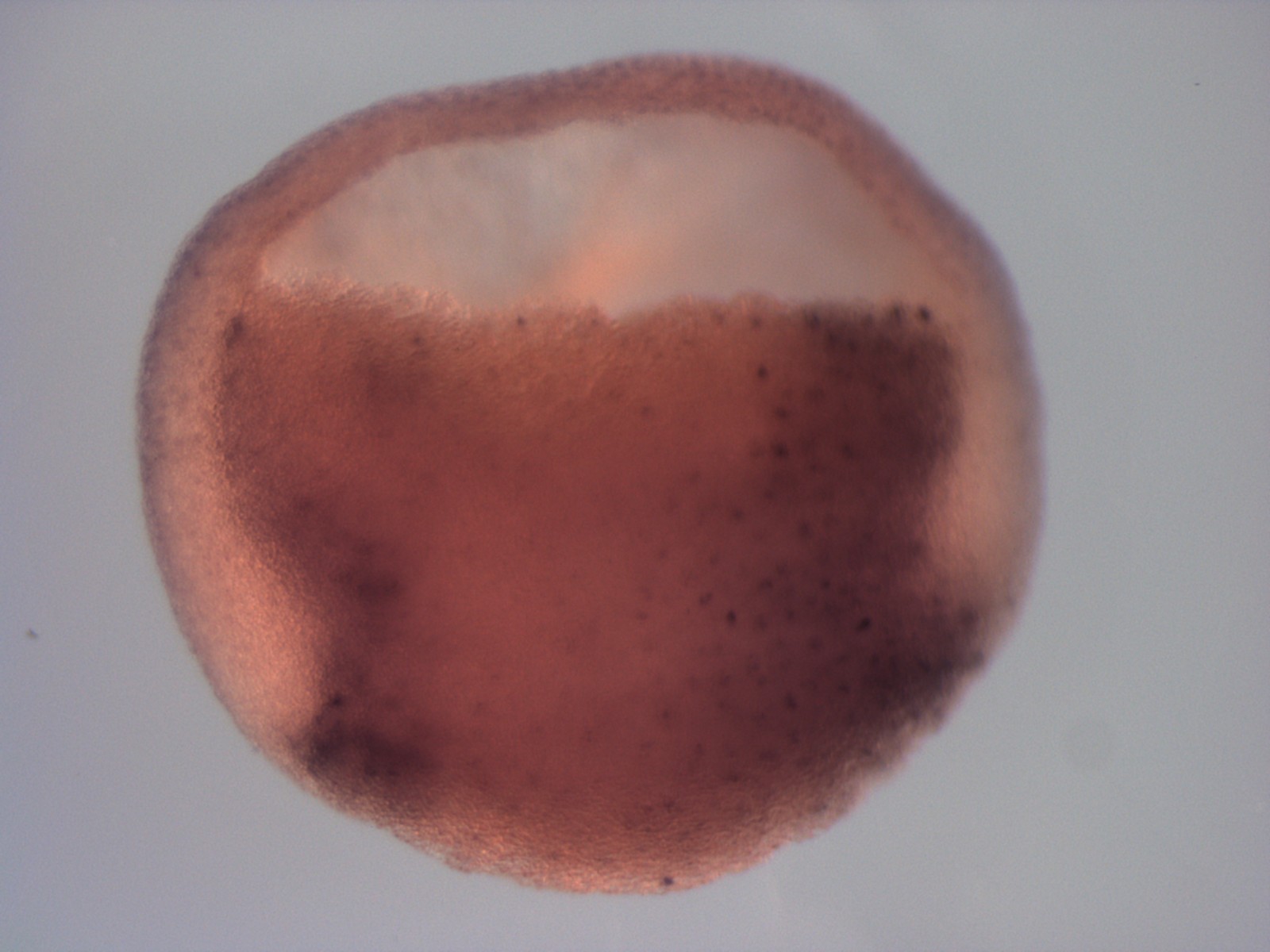 mixer (mix-like endodermal regulator) mixer (mix-like endodermal regulator)gene expression in bisected Xenopus laevis embryo, mid-sagittal section, assayed via in situ hybridization, NF stage 10.5, dorsal left, animal pole up.