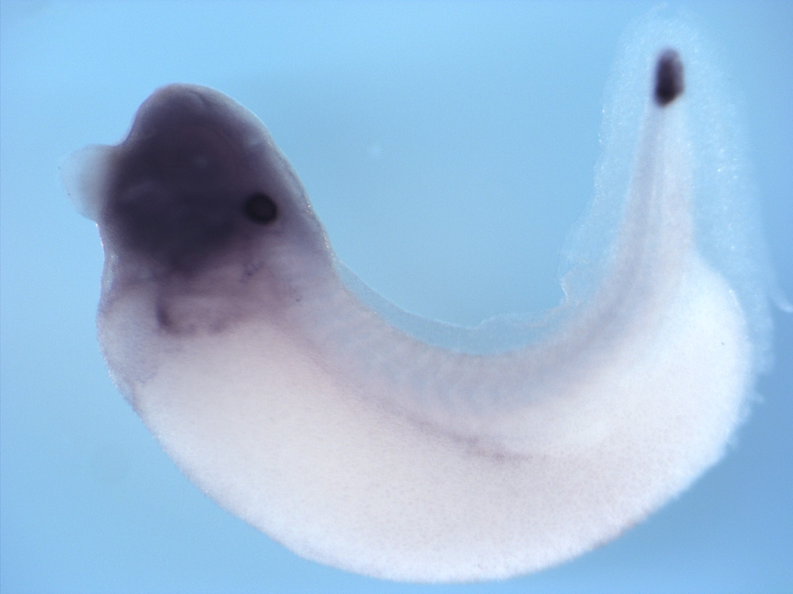 pcdh8.2 (protocadherin 8, gene 2 ) gene expression in Xenopus laevis embryo, assayed via in situ hybridization, NF stage 35 & 36, lateral view, anterior left, dorsal up.