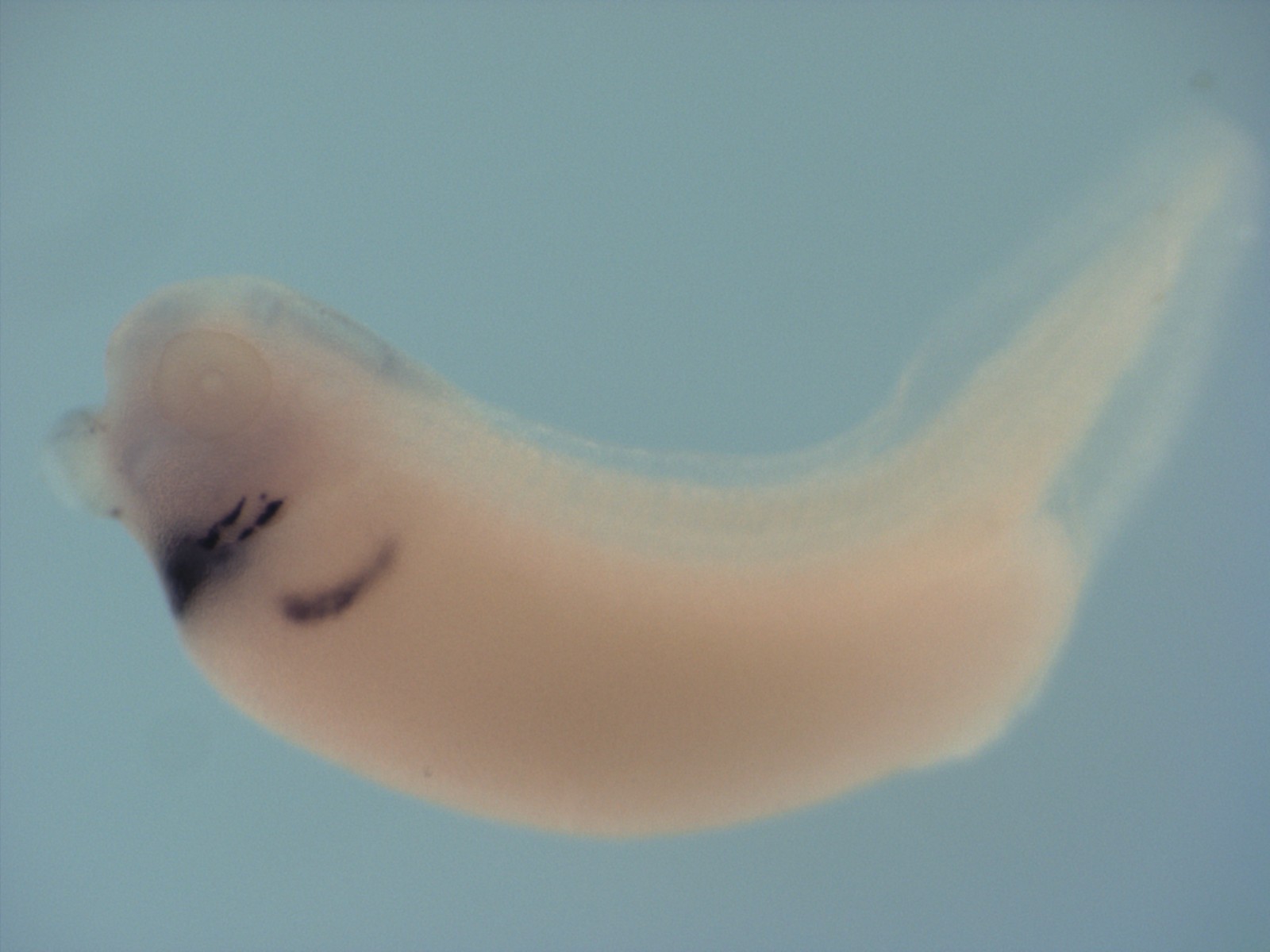 nkx2-5 NK2 homeobox 5) gene expression in Xenopus laevis embryo, assayed via in situ hybridization, NF stage 35 & 36, lateral view, anterior left, dorsal up Copyright © Zorn Lab, Aaron M Zorn Image published in: Zorn