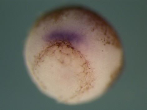 otx2 (orthodenticle homeobox 2) expressed in Xenopus tropicalis embryo assayed via in situ hybridization, NF stage 10.5/11, dorsal up.