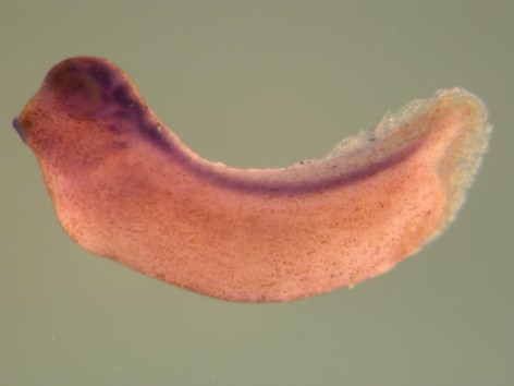 arl8a (ARF like GTPase 8A) gene expression in X. tropicalis embryo, NF stage 28/29, assayed via in situ hybridization, lateral view, anterior left, dorsal up. Copyright © Smith Lab, James C Smith Image published in: Smith ISH & MO Screen