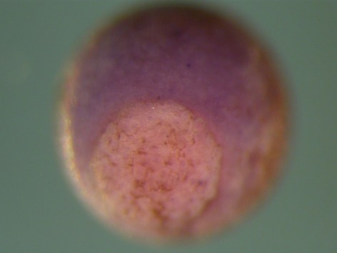 mfge8 (milk fat globule-EGF factor 8 protein) gene expression in Xenopus tropicalis embryo, assayed via in situ hybridization, NF stage 10.5, blastoporal view, dorsal up.