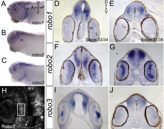 Fig. 2. robo genes are differentially expressed in the developing Xenopus retina. (Aâ G, Iâ J) Xenopus embryos processed for wholemount in situ hybridization for robo1, robo2, or robo3, shown as whole embryos (Aâ C), or in transverse vibratome sections (Dâ G, Iâ J). Robo1 expression is evident in the brain, otic vesicle and branchial arches (A). In stage 33/34 and 37/38 sections, robo1 label is present in the brain, but not in the retina (Dâ E). Robo2 is strongly expressed in migrating neural crest cells (B). Robo2 expression in the brain and eye is already strong at stage 33/34 (F), and becomes even more robust by stage 37/38 (G). Note the strong robo2 label in the GCL (**), with some weaker expression in the other retinal layers (Fâ G). (H) A Robo2 antibody was used to label a transverse cryostat section of a stage 37/38 retina. Robo2 protein is most readily detected in the RGCL (**) and the optic nerve head (arrowhead). The inset in H is an enlargement of the boxed region and shows a few RGCs and their dendrites (arrows) that are expressing Robo2. In wholemounts, robo3 mRNA is detectable in the brain, lens, branchial arches, and migrating cranial neural crest cells (C). A transverse section through a stage 33/34 embryo shows that robo3 mRNA is strongly expressed in the lens, but also weakly in the GCL (**, I). Expression in both locations is lost at stage 37/38 (J). Scale bar in D is 50â î¼m for Dâ G and Iâ J and 25â î¼m for H. A, anterior; br, brain; ba, branchial arches; D, dorsal; e, eye; L, lens; nc, neural crest cells; nr, neural retina; ot, otic vesicle; P, posterior; V, ventral. Image published in: Hocking JC et al. (2010) Copyright © 2010. Image reproduced with permission of the Publisher, Elsevier B. V.