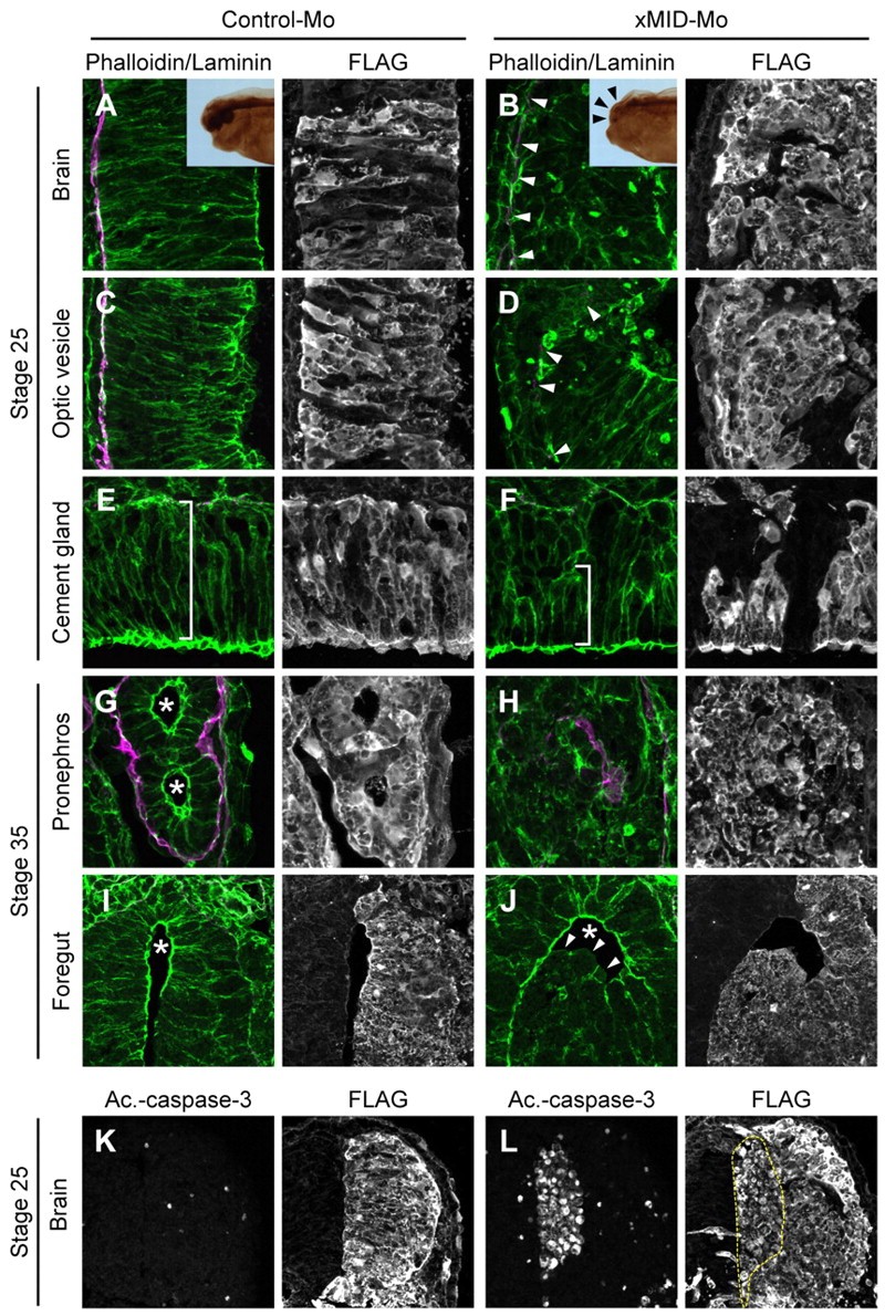 Fig. 7. xMIDs function in the developing brain and other epithelial organogeneses. (A-J) Transverse sections through the brain (A,B), optic vesicle (C,D), cement gland (E,F), pronephros (G,H) and foregut (I,J) of Xenopus embryos injected with control-Mo (A,C,E,G,I) or xMID-Mo (B,D,F,H,J), and stained with phalloidin (green), anti-laminin antibody (magenta), or anti-Flag antibody (gray). (A,B) Insets show stage 40 embryos stained for the pan-neural marker Xen1. Lateral views: anterior to the left, dorsal to the top. Arrowheads indicate head defects in the xMID morphant. (B,D) Arrowheads indicate non-continuous and attenuated laminin staining in the basal lamina. (E,F) Brackets indicate the lengths of Flag-positive cells. (G) Asterisks indicate tubular structures of the pronephros. (I,J) Asterisks indicate luminal structures of the foregut. Arrowheads indicate the lack of apical actin assembly in the xMID morphant cells. (K,L) Transverse sections through the brain of control-Mo-injected (K) and xMID-Mo-injected (L) embryos, stained with anti-active caspase 3 (left) and anti-Flag (right) antibodies. Dashed line delimits the ventricle. Image published in: Suzuki M et al. (2010) Copyright © 2010. Image reproduced with permission of the Publisher and the copyright holder. This is an Open Access article distributed under the terms of the Creative Commons Attribution License.