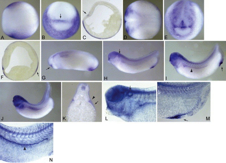Fig. 2. Expression of Xsl-1 RNA. All embryos are pictured with the anterior to the left unless otherwise noted (B,E,K). Stages 12 (AâC) and 17 (DâE) are shown from dorsal views (A,D), frontal views (B,E), where dorsal is to the top of the frame, and as saggital sections (C,F). Stages 24 (G), 28 (H), 33 (I,L,M), and 37 (J,N) are shown as lateral views. Panel K is a transverse section of a stage 37 embryo at approximately the level of fourth trunk somite. High magnification views of a cleared stage 33 embryo are pictured in L (anterior) and M (posterior). A high magnification view of expression in the pronephros, somites, and neural tube of a cleared stage 37 embryo is seen in N. Further description of the arrows and arrowheads can be found in Section 1. Image published in: Martin BL and Harland RM (2004) Copyright © 2004. Image reproduced with permission of the Publisher, Elsevier B. V.