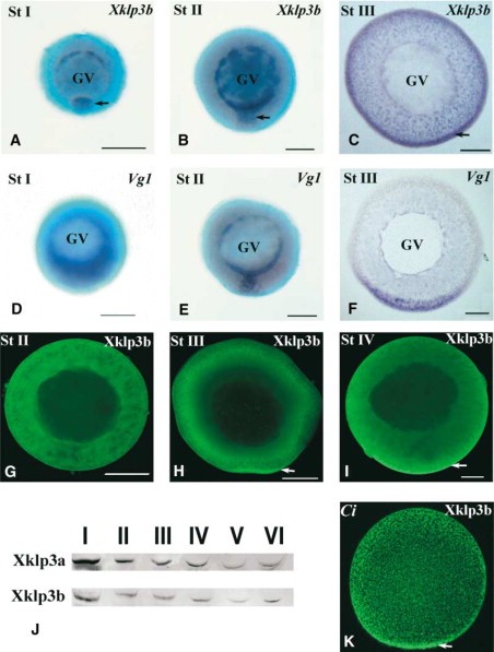 Figure 1. Expression and Localization of Heterotrimeric Kinesin II mRNA and Protein during Oogenesis(A–F) Whole mount in situ hybridization to endogenous Xklp3b (A–C) and Vg1 mRNA (D–F) in stage I (A and D), stage II (B and E), and stage III (C and F) oocytes. Arrows in (A)–(C) depict slight enrichment of Xklp3b mRNA in the mitochondrial cloud, wedge region, and vegetal cortex, respectively. GV is the germinal vesicle. The vegetal pole is oriented down in all images, and (C) and (F) are sectioned so that the cortex is visible. (G–I and K) Confocal images of Xklp3b-labeled Xenopus stage II (G), stage III (H), and stage IV (I) oocytes and an egg from Ciona intestinalis (K). Arrows in (H), (I), and (K) indicate enrichment of kinesin II at the vegetal cortex. (J) Western blots of whole-cell extracts prepared from stage I–VI oocytes via Xklp3a- and Xklp3b-specific antibodies. The scale bar represents 100 μm.